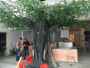 安徽合肥廬江縣宋家小院榕樹(shù),榕樹(shù)尺寸高3米直徑80cm蓬徑4.5米。工期5天。內(nèi)部采用鋼骨架結(jié)構(gòu)外部采用水泥直塑工藝。樹(shù)葉普通榕樹(shù)葉。