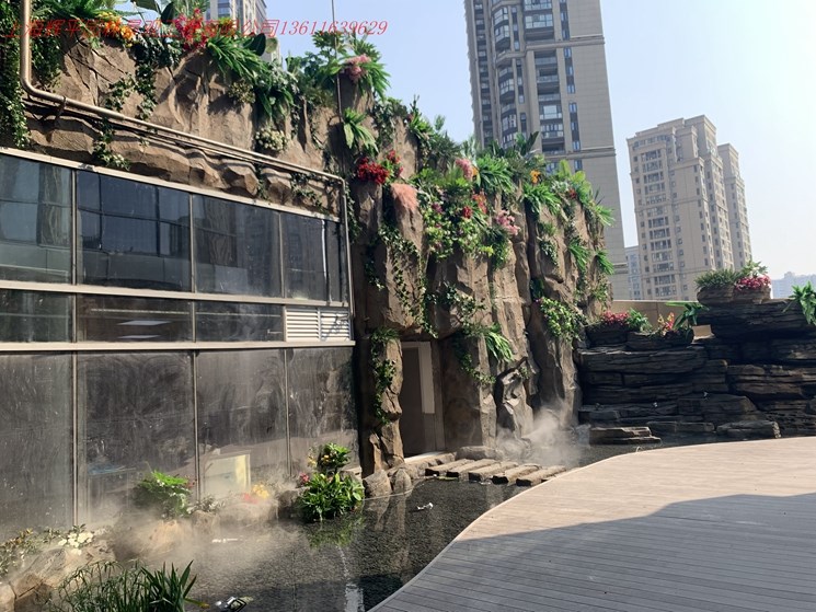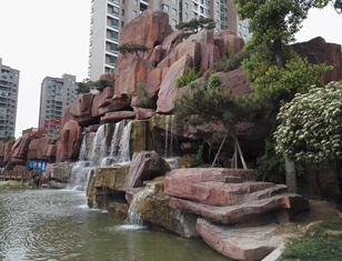 河南周口融輝地產(chǎn)仿真塑石假山,內(nèi)部包房子塑石假山,長度150米最高點18米,采用70%仿真度?偯娣e26000平方米。施工工期5個月。呈現(xiàn)出高山流水效果。