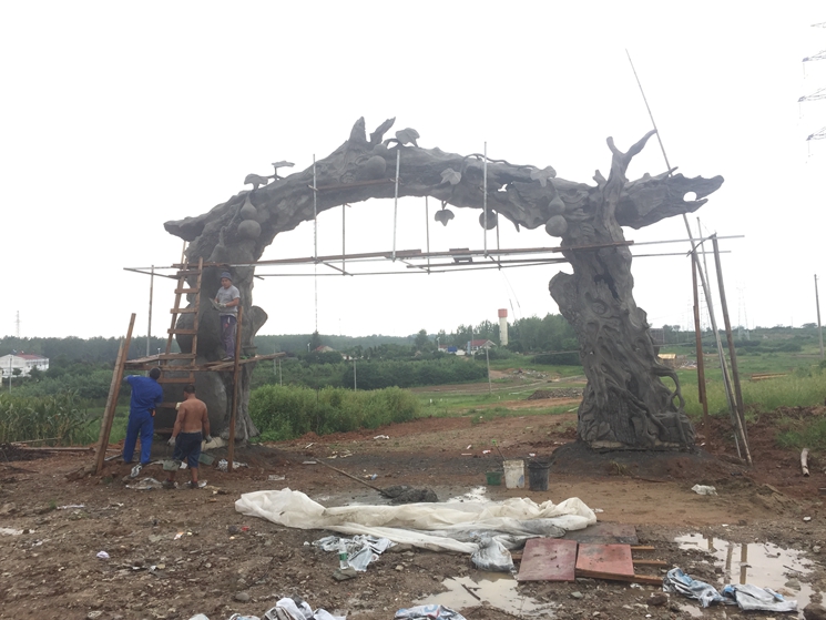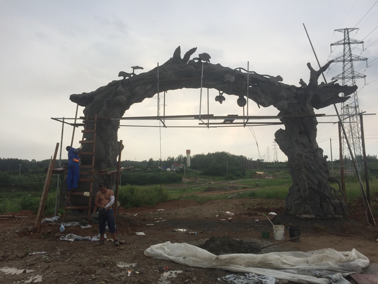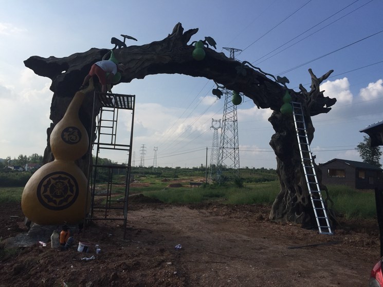 安徽明光福祿養(yǎng)老院生態(tài)仿真景觀大門(mén),整體設(shè)計(jì)師靈感采用葫蘆與千年老樹(shù)結(jié)合。五個(gè)葫蘆寓意五福,千年古樹(shù)寓意長(zhǎng)命千年。本項(xiàng)目建設(shè)時(shí)間是在炎熱的夏季給施工師傅嚴(yán)峻的考驗(yàn)。施工工藝采用內(nèi)部鋼骨架結(jié)構(gòu)和水泥塑形結(jié)合。工期25天。